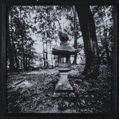 Fás ligetben magányos kőlámpás.