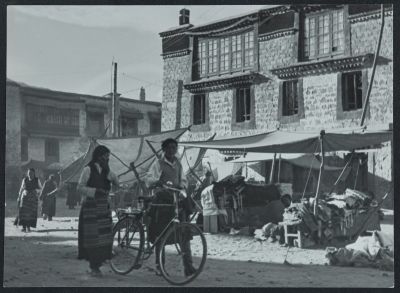 Földes utca. az épületekelőtt árnyékvetők alatt árusok. Elöl egy férfi biciklit tol, mellette egy asszony hagyományos viseletben. Távolabb egy asszony közeledik, egy szerzetes távolodik.