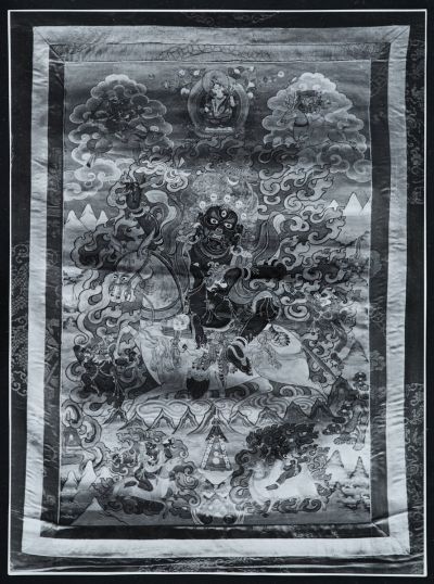 Lovon ülő, koponyakoronát viselő, lángok előtt megjelenő, a homlokán harmadik szemmel ábrázolt istenséget ábrázoló, textilre festett képről készült fotó, restaurálás közben. A fotó a restaurálás előtti állapotot mutatja. A fotón a teljes festett textilkép látható, a textilkeret nélkül.