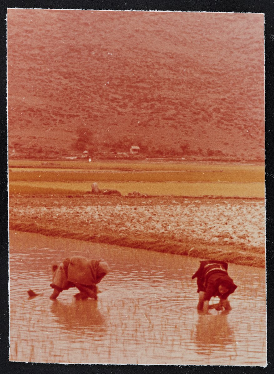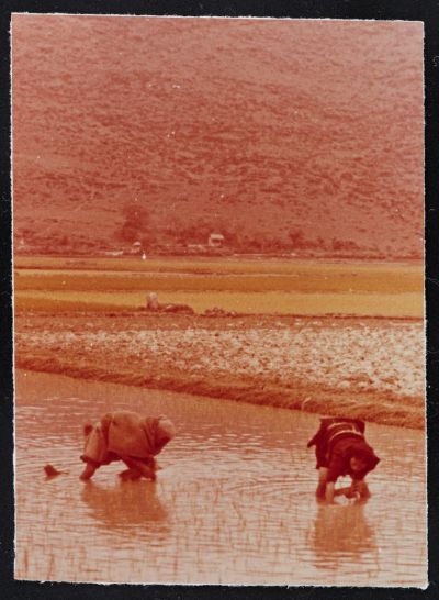 Két asszony rizst palántáz, a háttérben a földek és a hegyoldal. Rév Miklós fotóművész 1959-ben fényképezett Észak-Vietnámban, az akkori Vietnámi Demokratikus Köztársaságban. Patkó Imre újságíróval közös útjáról 1960-ban "Vietnam" címen megjelent kötetükben tudósítottak.