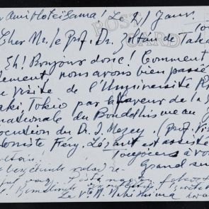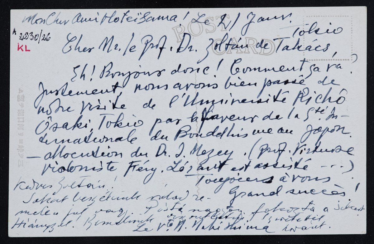 N. Nabeshima és Féry Lóránt francia és magyar nyelvű, fekete-fehér képeslapja Felvinczi Takács Zoltánnak Tokióból