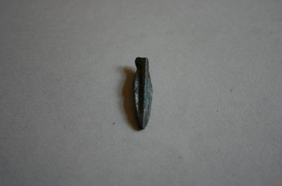 Kétszárnyú bronz nyílhegy, pengéje körszelet idomú, köpűje hengeres. Köpűjének egy része letörött.