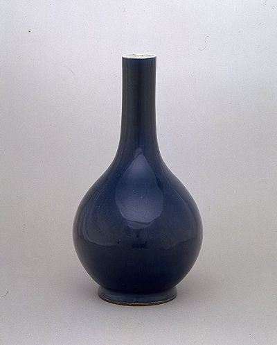 Kerek, magas talapzaton álló, hosszú, megnyújtott körte formájú vázatest, hengeres, egyenes, hosszú nyakkal. Az egész felületet mélykék kobalt-oxid máz (jilan) borítja, amely a Ming-kor elejének kék mázas szertartási kerámiáit idézi.