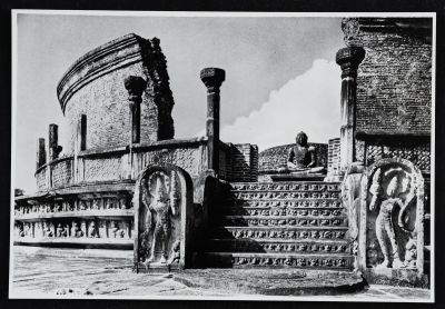A kép középpontjában Buddha ülő alakja látható, téglából épített, de részben leomlott köríves falak között. Buddha szobrához faragással díszített lépcsősor vezet, a lépcsősor indulásánál mindkét oldalon íves fülkébe faragott álló alak látható. A talapzat egymás felett két sorban domborművel díszített.