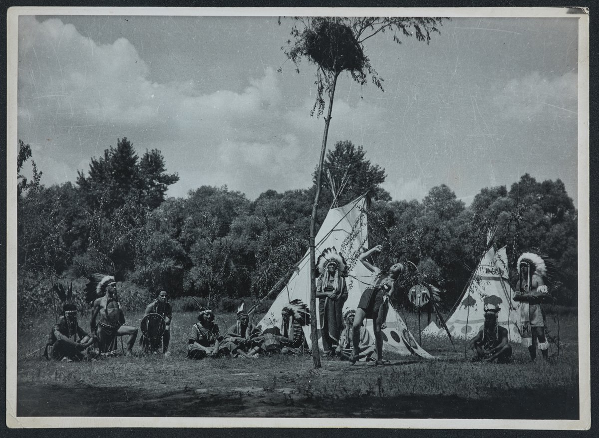 Férfiak és nők egy totemoszlop körül ülnek, háttérben tipik.