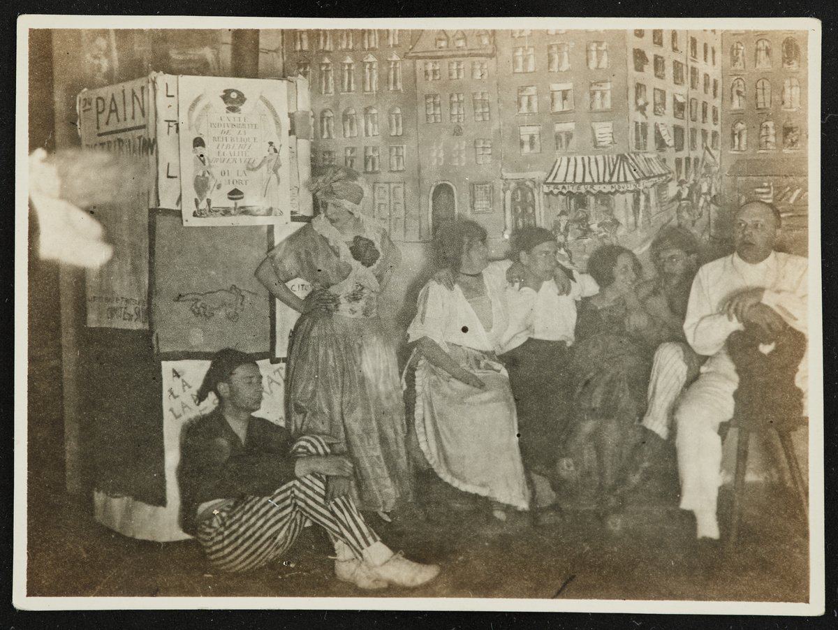 Színházi jelenet. Symposion Blattner Géza műtermében. Kézzel készített díszlet a háttérben.