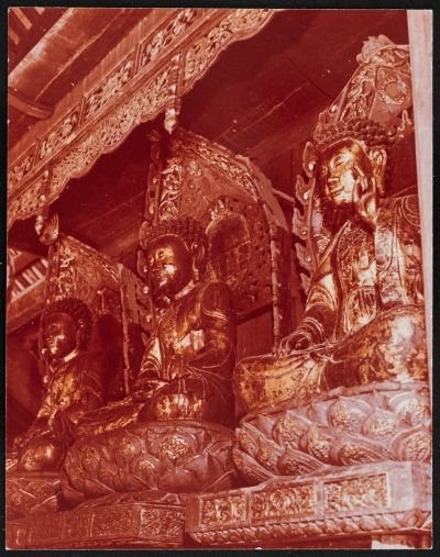 Három, aranyozott Buddha szobra látható a fényképen, egymás mellett sorakozva, gazdagon faragott lótusztrónuson; But Thap buddhista templom. Hasonló képek: Patkó Imre - Rév Miklós: Vietnam művészete. Budapest, Corvina Kiadó, 1967.