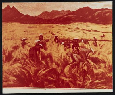 Phan Ke An (1923-2018) festő- és lakkművész rizsaratást ábrázoló festményéről készült fénykép. Vietnámi kalapos emberek sarlókkal gyűjtik be a termést, a háttérben hegyvonulat. Hasonló képek: Patkó Imre - Rév Miklós: Vietnam művészete. Budapest, Corvina Kiadó, 1967.