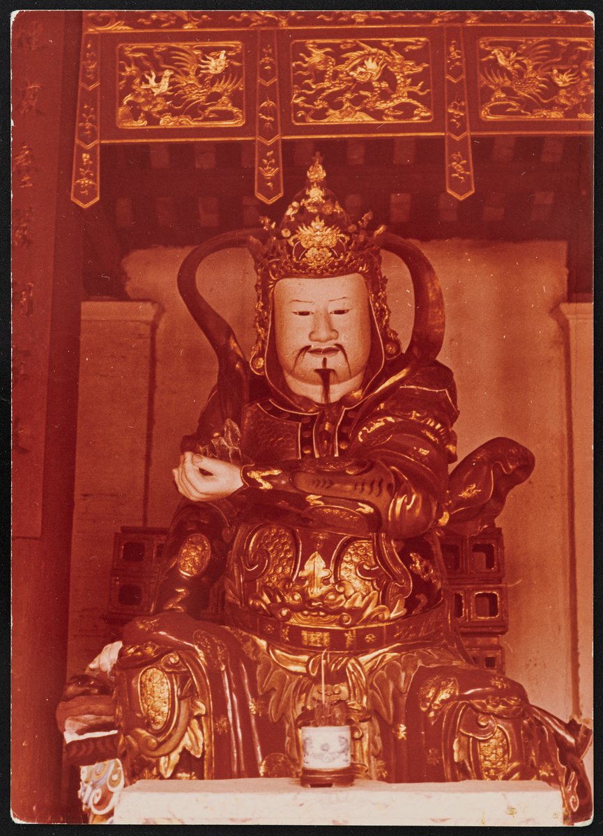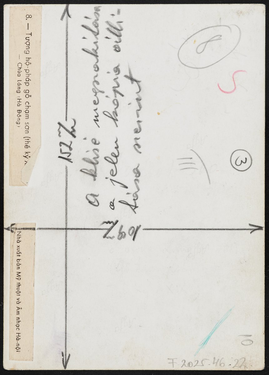 Színes fotó dharmapálát, a buddhista tanok védőistenségét ábrázoló faszoborról; díszes páncélzatban, bal kezében maga előtt sziklát tartva jelenik meg. Feje fölött a díszített mennyezeten sárkányalakos díszítés. A szobor előtt kis csészsében áldozati füstölők láthatók. (20. századra datált - Lang Pagoda (Ha Dong). Hasonló képek: Patkó Imre - Rév Miklós: Vietnam művészete. Budapest, Corvina Kiadó, 1967.