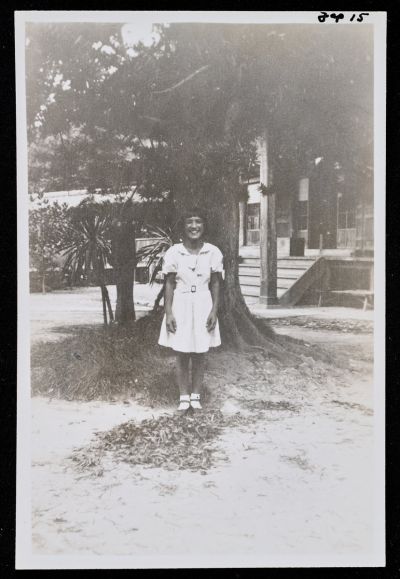 Toki Kimiko egy hatalmas fa törzse előtt, Kamakura