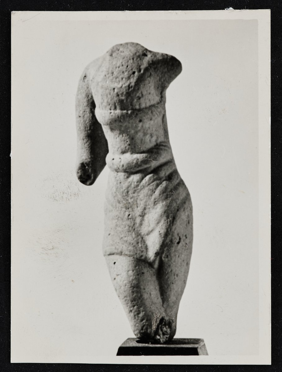 Feltehetően az Indiai Gyűjtemény gandhárai anyagához kapcsolódó töredék, fej és végtagok nélküli torzó, redőkben aláhulló textilábrázolással. A fekete-fehér fotó hátolfalán ragasztó nyomai találhatók, valószínűleg fel lehetett korábban ragasztva.