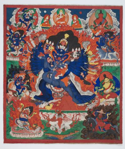 Bordűr nélküli thangka, mely kék testszíná Vazsrabhairava dharmapálát ábrázolja, aki Jamántaka leggyakoribb megjelenési formája. Oldalt, jobbra kilépő testtartásban, jab-jum helyzetben áll női energiájával, Vadzsravétalival. Kilenc feje közül a középső túlméretezett bikafej, két oldalán, körben három-három fej és a középső fölött még kettő, legfelül Mandzssríé. Harmincnégy kezében testrészek, fegyverek, tantrikus szimbólumok. A középső kettőben vérrel teli koponyacsésze és bárd. Vörösre festett, felfelé meredő haja lángol, fejein a haragvó istenekre jellemző koponyakorona, homlokán harmadik szem, meztelen testén ékszerek, nyakában emberfejfüzér. Tizenhat lábával élőlényeken tapos. Női energiája fején koponyakorona, két kezében koponyacsésze és bárd. Felette Congkhapa és két láma. Körülötte békés és haragvó istenségek.