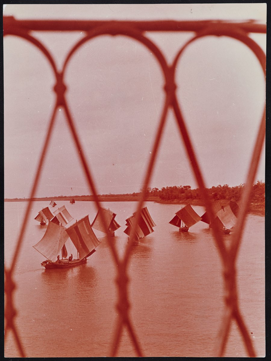 Vitorlás csónakok (sampánok) haladnak a vízen, íves kerítésrács mögül fotózva. Rév Miklós fotóművész 1959-ben fényképezett Észak-Vietnámban, az akkori Vietnámi Demokratikus Köztársaságban. Patkó Imre újságíróval közös útjáról 1960-ban "Vietnam" címen megjelent kötetükben tudósítottak.