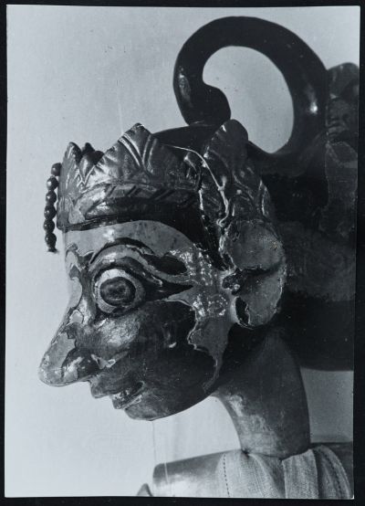 Zboray Ernő gyűjteményéből származó wayang golek harcos figurájának (ltsz. 66.48) fejéről készült fotó restaurálás közben. A fotó a restaurálás előtti állapotot mutatja. A báb arca bal oldali profilból látható a fotón. A báb arcán és bal fülén jól kivehetők a festékhiányok.