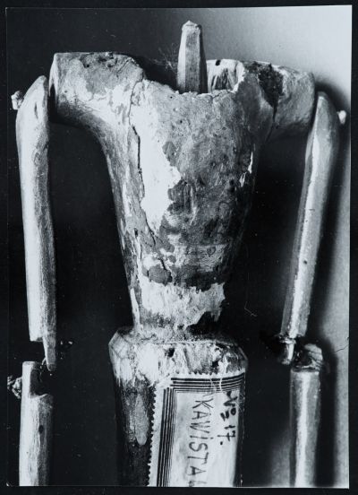 Zboray Ernő gyűjteményéből származó wayang golek előkelő figurájának (ltsz. 66.51) testéről készült fotó restaurálás közben. A fotó a restaurálás előtti állapotot mutatja. A báb teste szemből látható, testén jól kivehetők a festékhiányok.