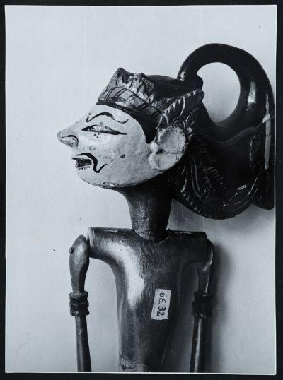 Zboray Ernő gyűjteményéből származó wayang golek figurájának (ltsz. 66.32) fejéről és testéről készült fotó restaurálás közben. A fotón a báb arca bal oldali profilban, teste szemből látható, a trestaurálás előtti állapotot mutatja, festékhiányokkal az arcon és a szemen .