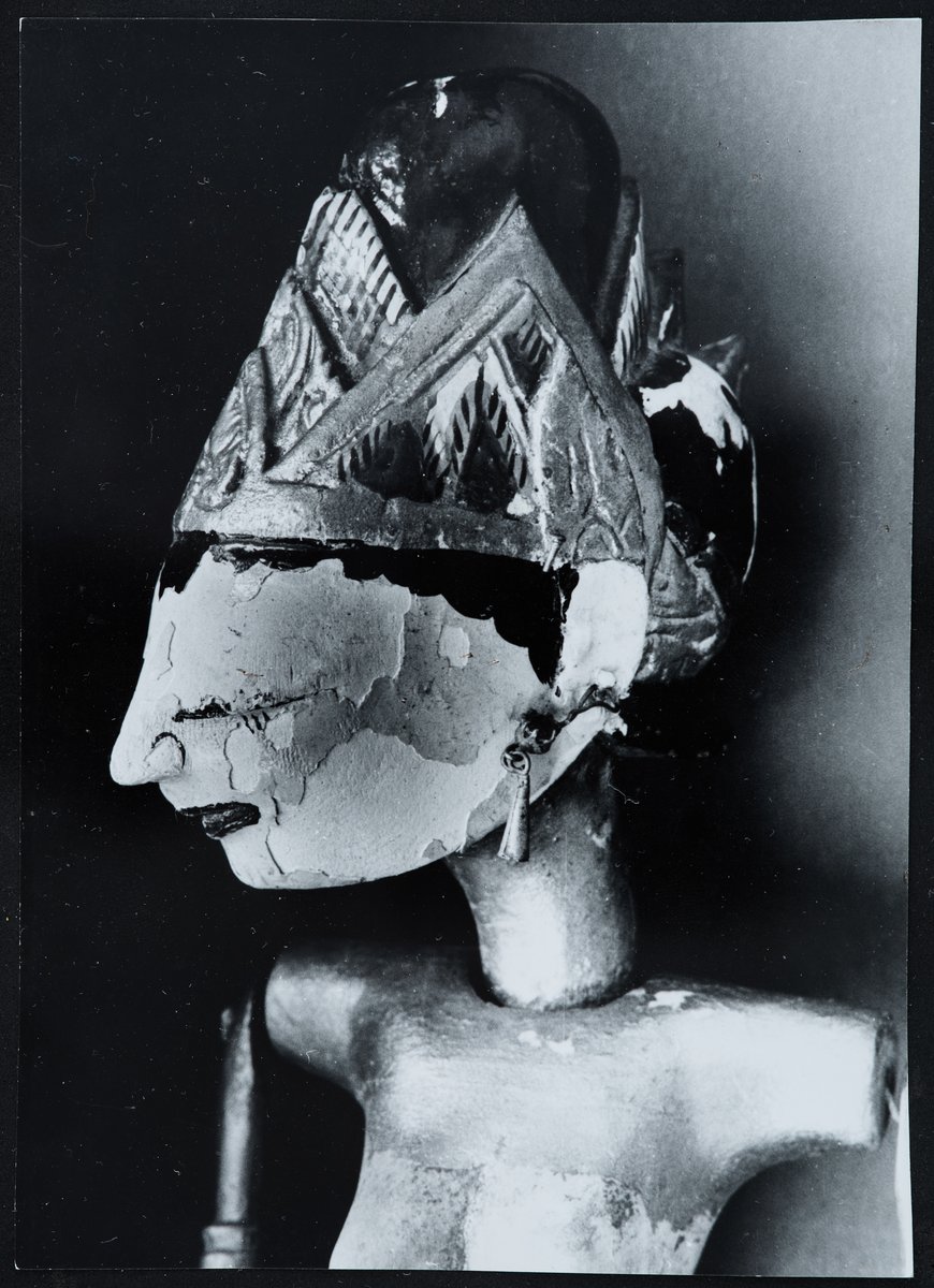 Zboray Ernő gyűjteményéből származó női wayang golek figura (ltsz. 66.43) büsztjéről készült fotó restaurálás közben. A fotó a restaurálás folyamatában lévő mutatja. A báb arcán, bal mellénél és a kontyrészen jól kivehetők a festékhiányok. A báb arca bal oldali profilból látható a fotón.