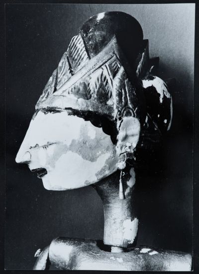 Zboray Ernő gyűjteményéből származó női wayang golek figura (ltsz. 66.43) fejéről, nyakáról és a vállrészről készült fotó restaurálás közben. A fotó a restaurálás folyamatában lévő állapotot mutatja. A báb arcán, fülén, nyakán és a kontyrészen jól kivehetők a festékhiányok. A báb arca bal oldali profilból, és a nyak bal oldali festékhiánya látható a fotón.