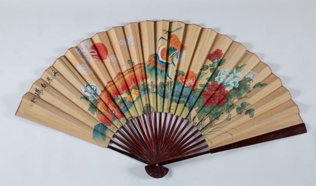 Nap felé repülő főnix és virágzó rózsabokor motívummal díszített, élénk színekkel (piros, sárga, kék, zöld) festett legyező. A hátulján felirat kínai karakterekkel: ’a vörös főnix a Nap felé száll’.