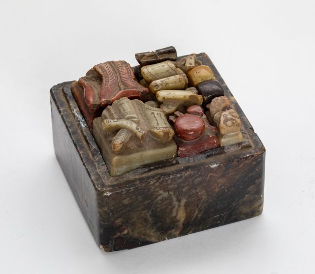Kozma Lajos pecsétjei a nyolc taoista halhatatlan jelképeivel és egy saját vésésű pecsét lenyomata. Márvány dobozban tíz darab hasábforma pecsétrúd. Tetejükön a nyolc taoista halhatatlan jelképeivel. Három pecsét Kozma Lajos szignójával vagy pecsétjelével megfaragva. Valószínűleg Párizsban vásárolta Kozma.